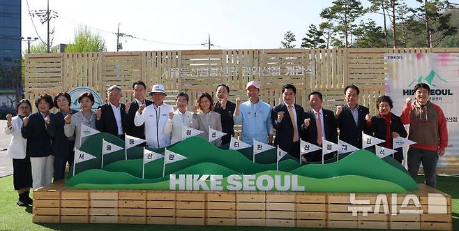 [서울=뉴시스] 조수정 기자 = 오세훈 서울시장이 24일 서울 관악구 서울 등산관광센터 관악산점에서 열린 개관식에서 참석 내빈들과 개관축하 세리머니를 하고 있다. 2025.04.24. chocrystal@newsis.com