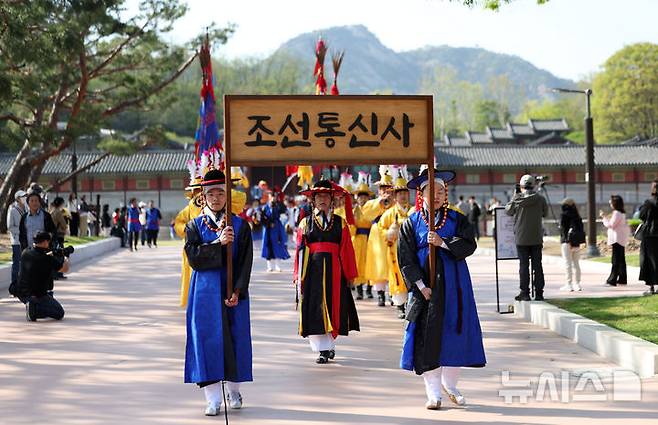 [서울=뉴시스] 김선웅 기자 = 24일 서울 종로구 경희궁에서 한일 국교 정상화 60주년을 기념하는 조선통신사 행렬 재현행사가 열리고 있다. 2025.04.24. mangusta@newsis.com