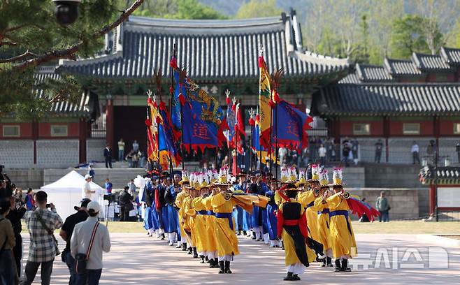 [서울=뉴시스] 김선웅 기자 = 24일 서울 종로구 경희궁에서 한일 국교 정상화 60주년을 기념하는 조선통신사 행렬 재현행사가 열리고 있다. 2025.04.24. mangusta@newsis.com