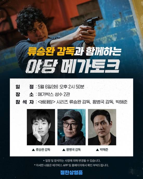 이어서 5월 6일(화) '베테랑'을 연출한 류승완 감독과 함께하는 메가토크에는 박해준, 황병국 감독이 참석할 예정이다. 류승완 감독의 차기작에 '휴민트'에 출연하는 박해준과 '베테랑', '부당거래' 등 류승완 감독의 여러 작품에 출연하였던 황병국 감독이 참석해 입담 좋기로 유명한 류승완 감독과 만들어갈 흥미로운 토크에 기대가 모아지고 있다.