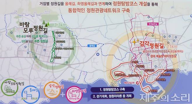 서귀포시는 혁신도시과 구도심 권역에 조성되는 거점별 정원길을 올레길, 하영올레길과 연계해 정원탐방코스를 개설, 걷기대회나 정원 마라톤을 개최하는 등 통합적인 관광네트워크를 구축할 방침이다.
