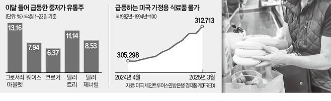 최근 미국의 식탁 물가는 빠르게 뛰고 있다. 세인트루이스연방은행 경제통계(FRED)에 따르면 지난달 미국의 식료품 물가지수는 전달 대비 0.49% 올랐다. 2022년 10월 이후 가장 큰 상승폭이다. 트럼프 대통령이 적용을 유예하고 있는 고율 관세가 부과되면 농산물부터 가공식품, 각종 생활용품 등의 가격이 광범위하게 뛸 것이란 게 대체적인 관측이다.