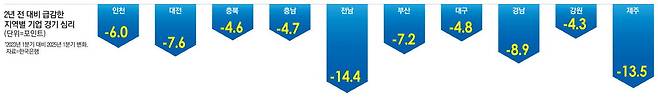 지역별로 보면 제주(-31.7포인트), 부산(-17.7), 경남(-17.0), 대전(-12.3) 내수판매 낙폭이 두 자릿수에 달했다. 소비심리가 꽁꽁 얼어붙었다.