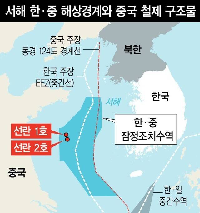 한-중 양국이 23일 서울에서 연 ‘제3차 해양협력대화’에서는 양국의 200해리 배타적경제수역(EEZ)이 겹치는 서해 잠정조치수역에 중국이 일방적으로 설치한 대형 구조물 문제가 주요하게 다뤄졌다. 이번 회의에서 중국은 필요하면 한국 측 관계자들의 서해 시설물 현장 방문을 주선하겠다는 입장을 밝힌 것으로 전해졌다.
