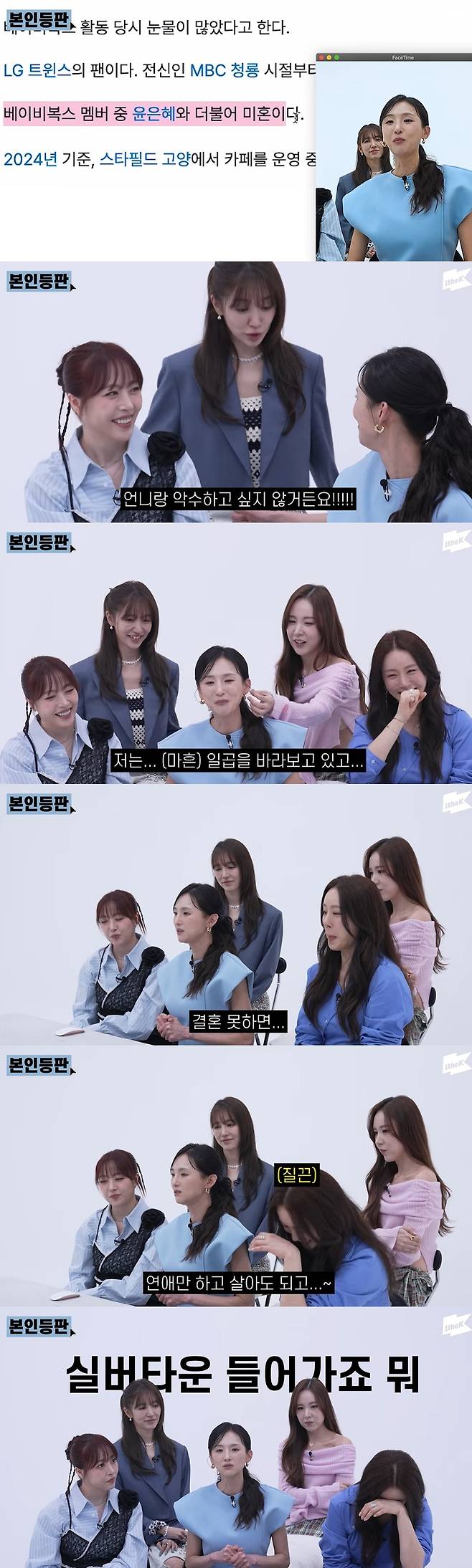 해당 영상에는 베이비복스 완전체가 출연해 온라인상에 정리된 자신들의 정보를 직접 확인하며 이야기를 나눴다. 이희진은 과거 2019년 SBS '런닝맨'에 출연해 "연하는 상대방의 인생을 잡아먹어 버리는 게 될까봐 부담스러워 싫다"고 밝힌 바 있다.