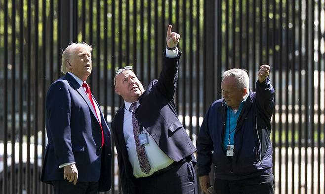 | 트럼프 “사비로 백악관에 대형 성조기 설치” 도널드 트럼프 미국 대통령(왼쪽)이 23일(현지시간) 워싱턴 백악관의 북쪽 정원 노스론에서 정원 관리 책임자로부터 대형 깃대 설치에 대한 설명을 듣고 있다. 트럼프 대통령은 이날 취재진에게 “백악관에 성조기를 게양할 높이 100피트(약 30m)에 달하는 두 개의 최고급 깃대를 설치할 것”이라며 설치 비용은 사비로 지불할 예정이라고 밝혔다. 그의 말대로 깃대가 설치되면 백악관 본관 옥상 외에 양쪽 정원인 사우스론, 노스론에도 대형 성조기가 게양된다. 워싱턴=AP연합뉴스 |