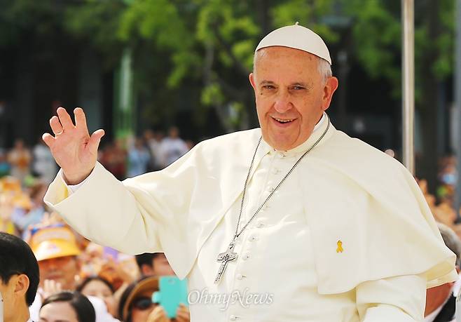 | ▲ 2014년 8월 16일 프란치스코 교황이 오전 서울 광화문광장에서 열리는 '윤지충 바오로와 동료 123위 시복미사'에 앞서 카퍼레이드를 하며 신도들에게 손을 흔들어 인사를 하고 있다. 교황의 옷에는 세월호참사 희생자들을 추모하는 '노란리본' 배지가 달려 있다. |