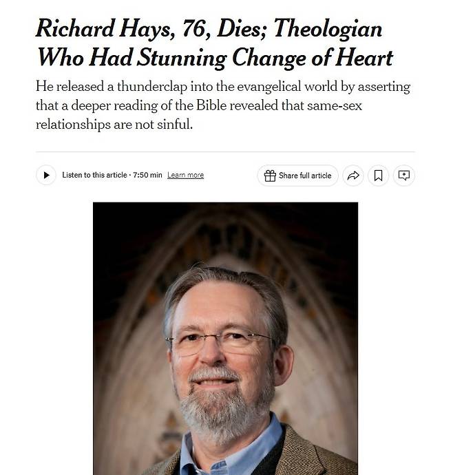 지난해 10월 댈러스 월셔 침례교회에서 열린 센터피스 콘퍼런스에 참석한 리처드 헤이스는 성소수자 신자들이 모인 앞에서 이렇게 말합니다. 자신의 부고가 "동성애자 포용에 반대했던 신약학자 리처드 헤이스가 별세했다"가 아니라 "동성애자 포용에 대한 생각을 바꾼 신약학자 리처드 헤이스가 별세했다"가 되길 바란다고요. 그리고 실제로 췌장암이 재발해 올해 1월 세상을 떠난 리처드 헤이스의 죽음을 알리는 <뉴욕타임스>의 부고 기사의 제목은 아래와 같습니다.