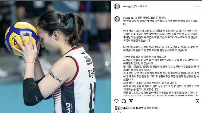 그는 이어 "선수 생활을 하면서 힘든 순간이 많았지만, 사랑하는 가족과 남편, 좋아하는 언니, 친구, 동생들 덕분에 잘 이겨낼 수 있었던 거 같다"면서 "응원해 주신 모든 분에게 진심으로 감사드린다"고 고마움을 표현했습니다.