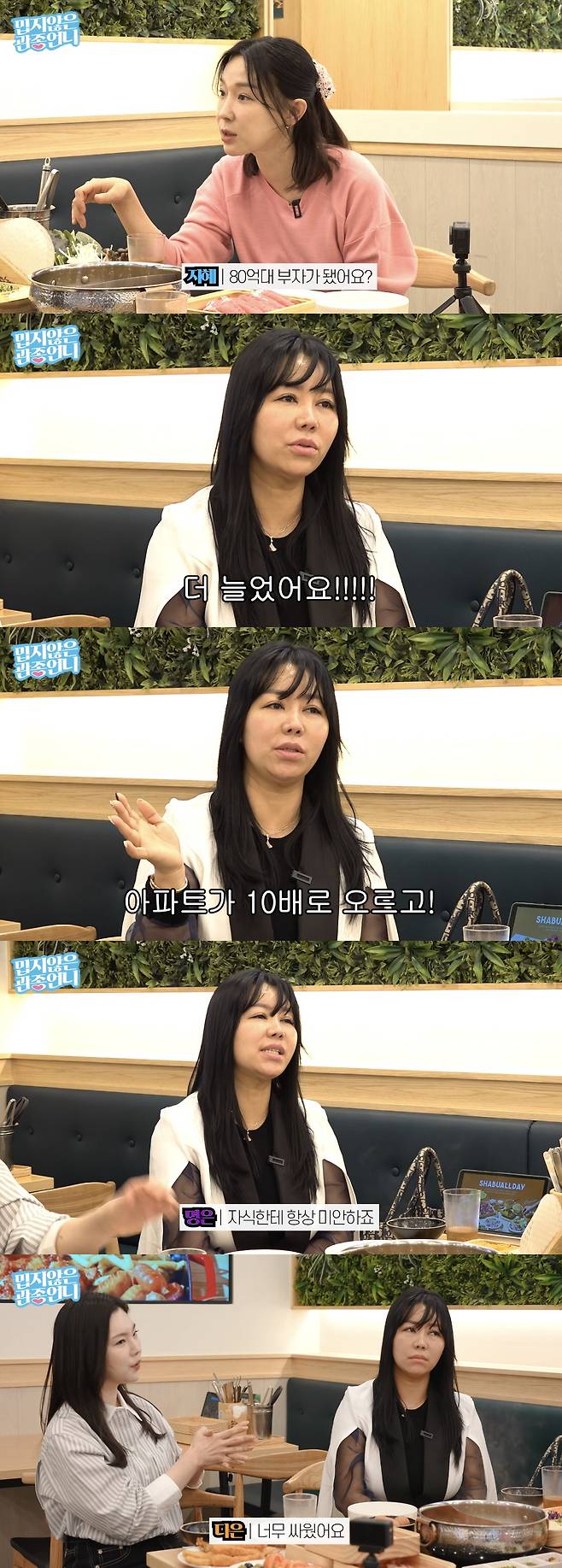 그러자 이지혜는 "몸은 힘들지만 그래서 부자가 된 거 아닌가. 50억대 자산가로 알고 있는데 더 돈을 벌어 80억대 부자가 됐나?"라고 물었다. 10기 정숙은 "더 늘었다. 젊었을 때 안 해본 일이 없다. 신문 배달, 구두닦기, 고깃집 불판닦기, 대리운전까지 했다. 그돈을 모아 아파트를 샀는데 10배가 올랐다. 그게 대박이 나서 그 돈으로 다른 곳에 투자를 했는데 그것도 대박이 나서 100억, 200억이 됐다"라며 현재 200억 자산가라고 밝혔다.