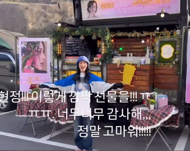 엄정화는 현재 드라마 '금쪽같은 내 스타'에서 25년 치 기억이 통째로 날아간 톱스타 역할을 맡아 촬영 중이다. 엄정화를 위해 고현정은 깜짝 선물로 커피 차를 보냈던 것이다. 엄정화는 감격의 멘트와 함께 "언니가 밥 살게"라며 고마움을 거듭 표현했다. 또한 엄정화는 같은 드라마 조명 감독과도 셀카를 찍으며 고현정의 커피 차를 인증했다.