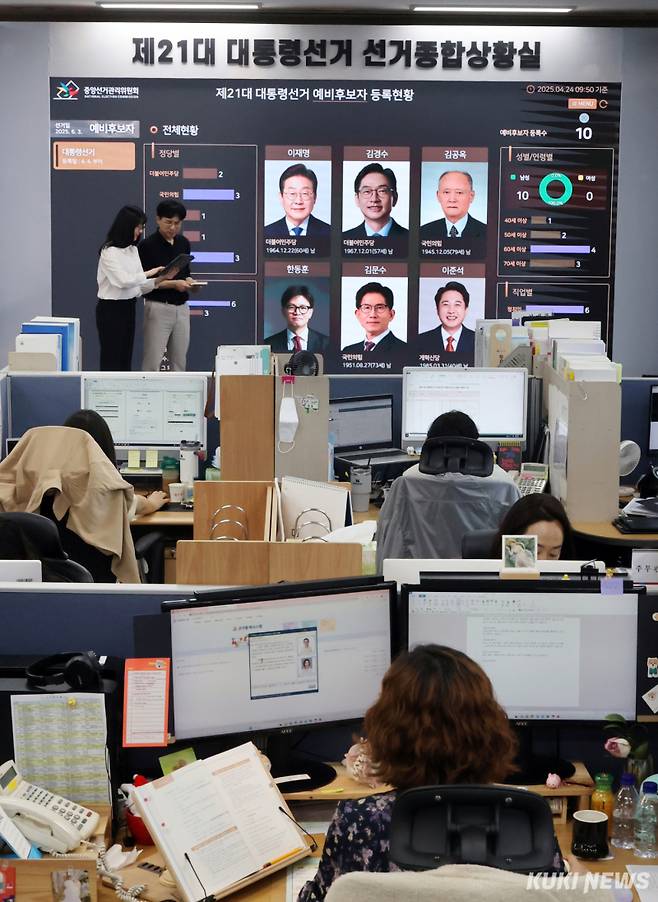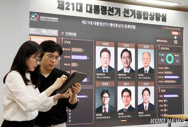 제21대 대통령 선거가 40일 앞으로 다가온 24일 경기 과천시 중앙선거관리위원회에 마련된 선거종합상황실에서 선관위 직원들이 예비후보 등록 현황판을 살펴보고 있다. 중앙선관위에 따르면 후보자등록은 5월 10일, 11일 양일간이고 후보자로 등록하고자 하는 공무원은 5월 4일까지 사직해야 한다. 선거운동은 5월 12일부터 선거 전날인 6월 2일까지 22일간이다.