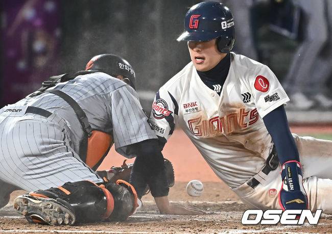 롯데 자이언츠 한태양이 8회말 1사 1,3루 정보근의 좌익수 플라이 아웃때 송구 실책으로 홈에서 세이프되고 있다. 2025.04.24 / foto0307@osen.co.kr