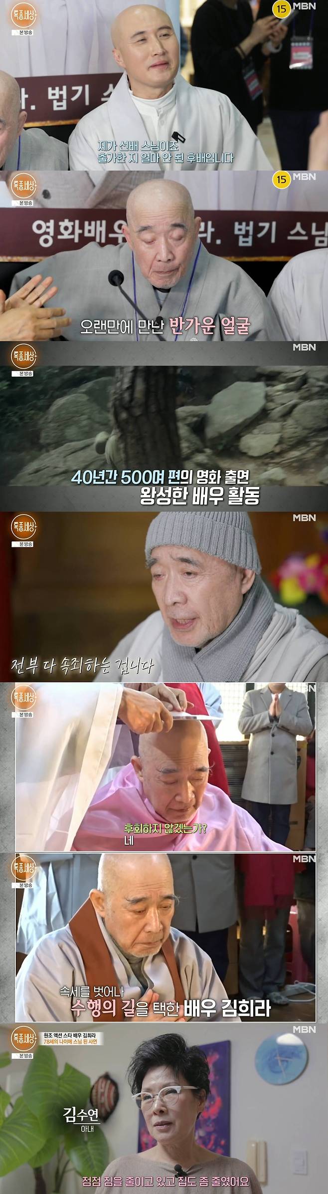 김희라는 1970~1980년대 원조 액션 스타로, 40년간 500여 편의 영화에 출연하며 왕성하게 배우로 활동했다. 삭발 수계식까지 봉행하고, '법기'라는 법명까지 받았다고.