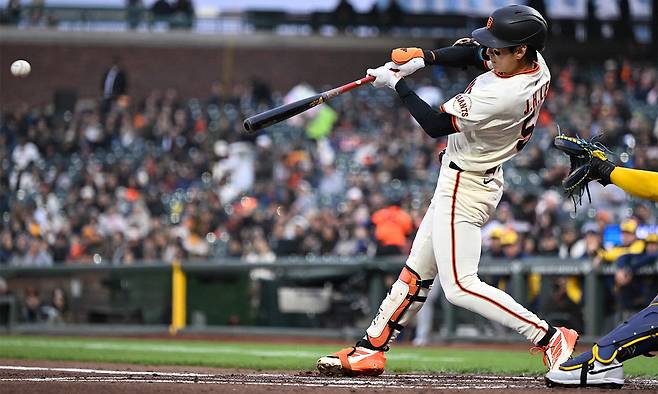 | 여전한 돌풍 샌프란시스코 이정후가 24일 미국 캘리포니아주 샌프란시스코의 오라클 파크에서 열린 2025 MLB 정규시즌 밀워키와 홈 경기에서 6회 안타를 치고 있다. 샌프란시스코=로이터연합뉴스 |