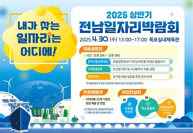 전남도는 30일 오후 1시부터 5시까지 목포시 상동 목포실내체육관에서 '2025 상반기 전남일자리박람회'를 연다.