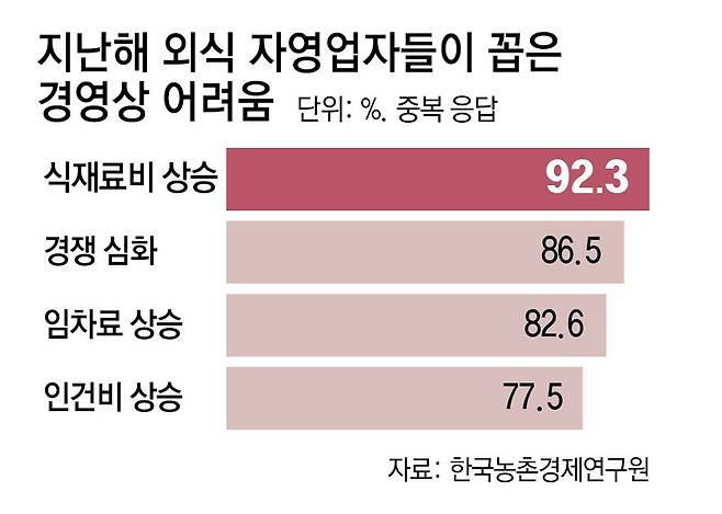 카페를 운영하던 20대 김모 씨는 가게를 연 지 1년도 안 된 지난해 7월 장사를 접었다. 카페를 찾는 손님의 발걸음이 끊기며 매출은 주는데, 우유와 달걀 가격 등이 계속 오르면서 다달이 적자가 났기 때문이다. 김 씨는 “한창 장사가 잘될 때조차 내 손안에 남는 건 매출의 절반도 안 됐다. 혼자 가게를 운영해 인건비 나갈 일이 없었는데도 이 정도”라며 한숨을 쉬었다.
