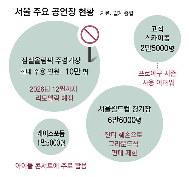 최대 6만6000여 명을 수용할 수 있는 서울월드컵경기장도 ‘잔디 훼손’ 논란으로 그라운드석 판매를 안 하는 등 사용이 까다로워졌다. 고척스카이돔(2만5000명) 역시 프로야구 시즌에는 사용이 불가능하다. 세계 최대 규모의 K팝 전용 공연장을 표방했던 ‘CJ라이브시티’는 공사비 상승 등으로 인해 지난해 결국 무산됐다.