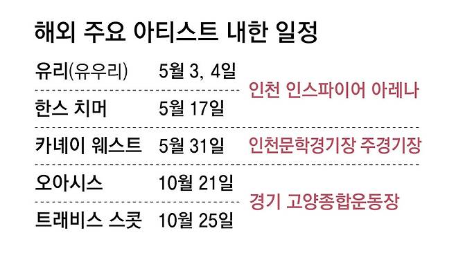 이름만 들어도 설레는, 올해 내한했거나 할 예정인 해외 팝스타들이다. 하지만 이들은 모두 경기 고양종합운동장 주경기장을 공연장으로 택했다. 다음 달 31일 내한하는 카녜이 웨스트 역시 인천문학경기장에서 팬들을 만난다.