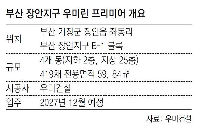 부산 기장군 장안읍 좌동리 부산 장안지구 B-1 블록에 들어서는 '부산 장안지구 우미린 프리미어'는 4개 동(지하 2층, 지상 25층), 419채 규모다.