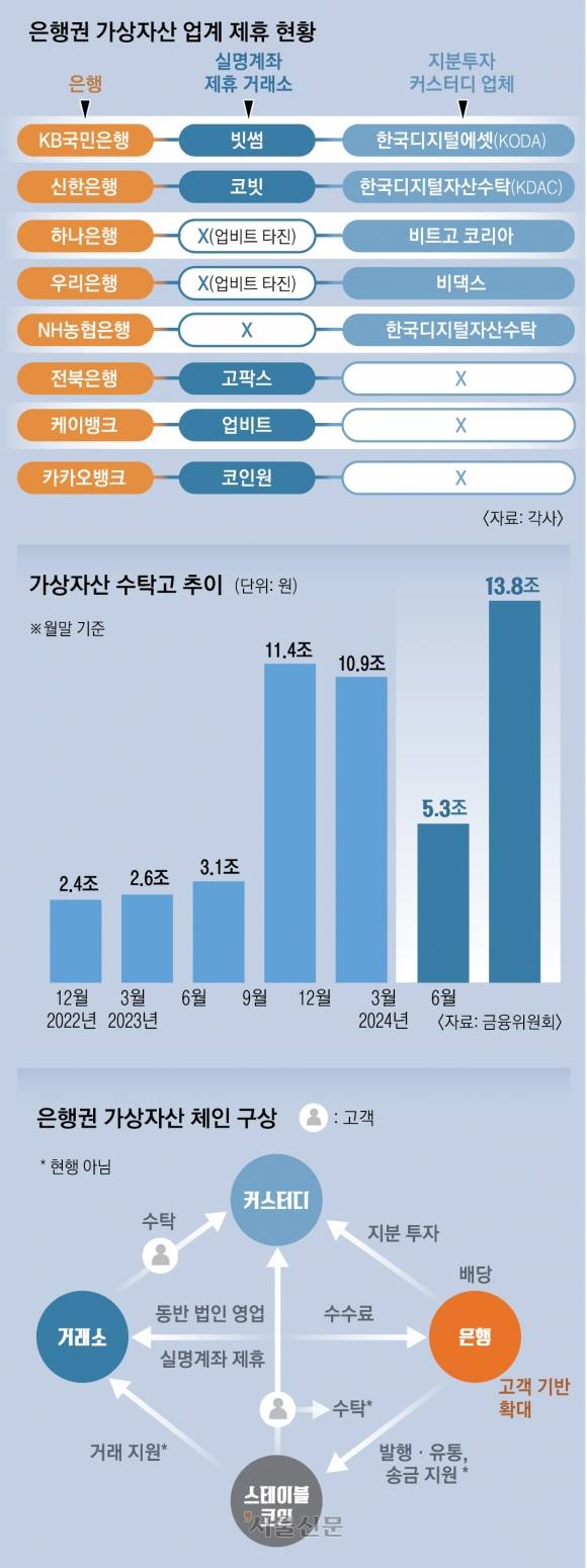 가상자산(암호화폐)이 점차 제도권으로 들어오자 금융업계에서도 보수적인 은행이 태도를 바꿔 적극적으로 문을 두드리고 나섰다. 우선 현행 제도상 가능한 범위에서 커스터디(수탁) 시장 진출로 시장 변화에 대응하는 모습이다. 물밑에선 ‘거래소-커스터디-스테이블코인 발행·유통’ 등으로 가상자산 체인을 구축하려는 큰 그림을 그리고 있다.