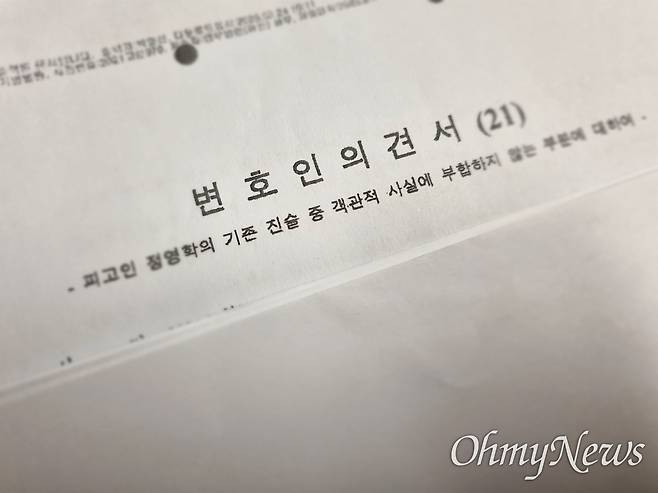 정 회계사 측 변호인은 지난달 11일 대장동 사건 민간업자들 재판부인 서울중앙지방법원 형사22부(부장 조형우)에 '변호인 의견서(21)'를 제출했다. 총 75페이지짜리 이 의견서의 부제는 '피고인 정영학의 기존 진술 중 객관적 사실에 부합하지 않는 부분에 대하여'라고 달렸다. <오마이뉴스>는 이 의견서를 입수했다.