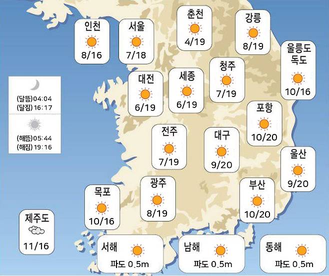 아침 최저기온은 서울 7.0도, 인천 8.0도, 수원 7.0도, 춘천 4.0도, 강릉 8.0도, 청주 7.0도, 대전 6.0도, 전주 7.0도, 광주 8.0도, 대구 9.0도, 부산 10.0도, 제주 11.0도로 예상됩니다.