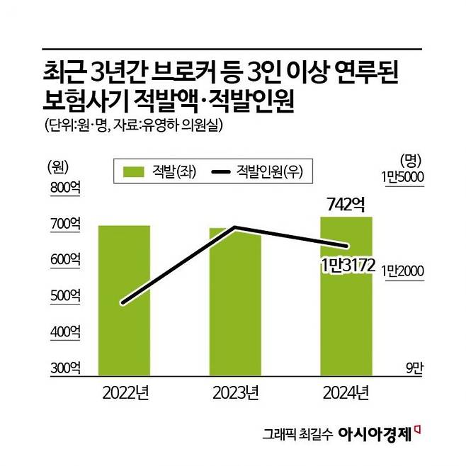 아시아경제가 유영하 국민의힘 의원실로부터 단독 입수한 자료에 따르면 브로커나 3인 이상이 연루된 보험사기는 2022년 718억원에서 2024년 742억원으로 3.3% 증가했다. 같은 기간 생명보험은 185억원에서 97억원으로 약 절반이 줄었지만 손해보험은 533억원에서 645억원으로 21% 늘었다. 손해보험 중에서는 장기보험이 2022년 122억원에서 2024년 230억원으로 88.5% 급증했다. 같은 기간 자동차보험은 365억원에서 402억원으로 10.1% 증가했다.