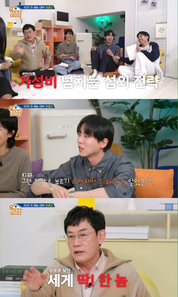 이에 송은이가 "(딸의) 결혼식 때 왜 후배 전체한테 청첩장을 안 돌렸냐"라고 물어보자 이경규는 "씀씀이가 센 놈들 몇 명만 불렀다"라고 답해 웃음을 자아냈다.