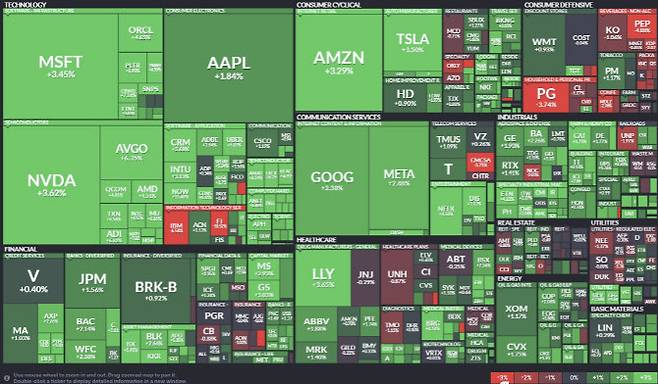 기술주들도 이날 대거 상승했다. 마이크로소프트(3.45%), 엔비디아(3.62%), 아마존(3.29%), 테슬라(3.5%) 등이 3% 이상 급등했다. 경기 침체 우려로 테크기업들의 투자가 축소될 수 있다는 우려가 나오는 가운데 아마존과 엔비디아가 인공지능(AI) 데이터 센터 건설이 둔화되지 않고 있다고 밝힌 게 호재였다.