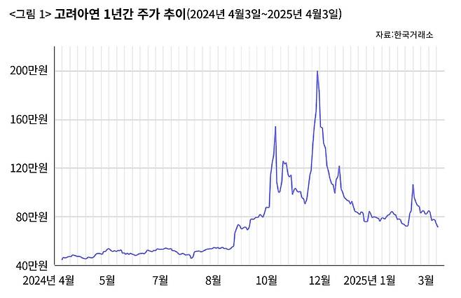 MBK·영풍은 지난해 10월4일, 고려아연은 10월23일 공개매수를 끝냈다. 이후 고려아연 주가는 오히려 폭등했다(〈그림 1〉 참조). 공개매수 완료 이후에도 양측이 각자 고려아연 주식을 더 사들일 수밖에 없을 것이라는 기대가 컸다. 지난해 10월25일, 고려아연의 종가는 125만3000원으로 치솟았다. 고려아연의 시가총액도 29조원으로 오르며 코스피 순위 10위로 진입했다. ‘윤석열 쿠데타’ 당일(2024년 12월3일), 고려아연의 임시주총이 2025년 1월23일로 결정된다. MBK·영풍 대 고려아연이 주총 때까지 ‘최후의 주식 매입 경쟁’을 벌일 것으로 기대되었다. 단기차익을 노린 기관 및 외국인 투자가 대거 유입된다. 주가는 단숨에 200만원까지 올라갔다(12월5일). 이날 고려아연은 시가총액(44조원) 기준으로 코스피 5위를 기록한다.