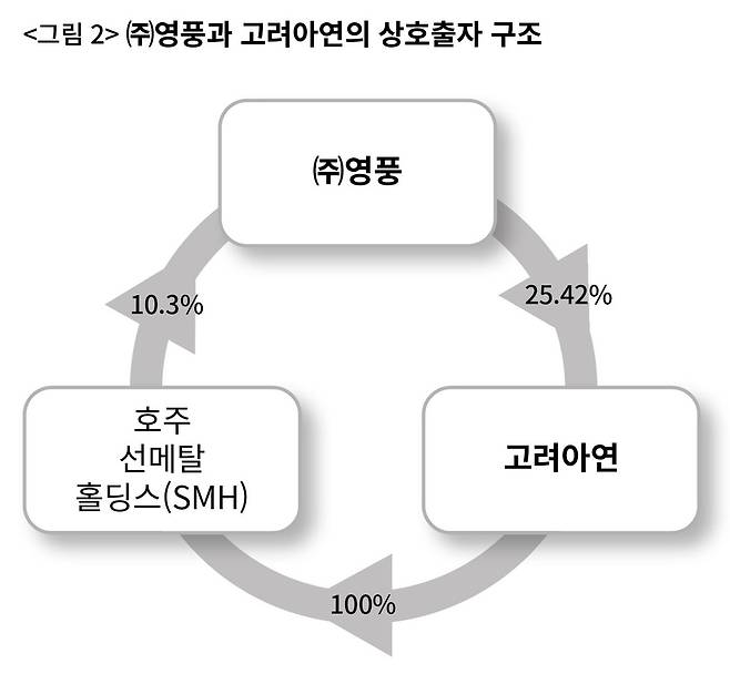 ㈜영풍은 고려아연의 대주주다. 그런데 고려아연의 100% 자회사인 SMC가 ㈜영풍 주식의 10.3%를 매입했다. 이로써 ‘㈜영풍→고려아연→SMC→㈜영풍’에 이르는 ‘상호출자’ 고리가 만들어졌다. SMC는 고려아연의 100% 자회사이므로 같은 기업으로 간주된다. 즉, ‘고려아연(SMC)이 ㈜영풍에 가진 지분율이 10.3%이므로 ㈜영풍은 고려아연에 대한 주식 의결권 25.4%를 행사할 수 없게’ 되어버린 것이다.