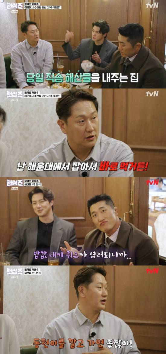 신승호는 "그리고 여기 그거 있다. 해산물을 이렇게 해주시는데 해산물이 당일로 올라오는 거다. 직송으로. 거기는 메뉴가 따로 없다고 한다. 당일날 올라온 거 가지고 있는 거"라며 해산물을 추천했고, 이대호는 "난 해운대에서 잡아서 바로 먹는다. 나 해산물 먹고 아니다 싶으면 바로 놓는다. 해산물은 냉정하다"라며 큰소리쳤다.