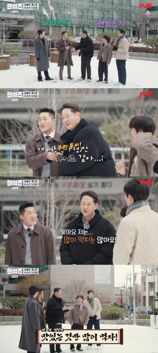 차태현은 "우리 프로그램이 무슨 프로그램인지 대충 정보를 듣고 왔냐"라며 기대했고, 이대호는 "프로그램 이름이 '핸썸가이즈'이지 않냐. (차태현, 오상욱) 여기 쪽은 핸썸, (김동현, 신승호) 여기는 가이즈냐. 다 핸썸인데 (김동현) 여기만 가이즈 같다"라며 재치 있는 입담을 뽐냈다.