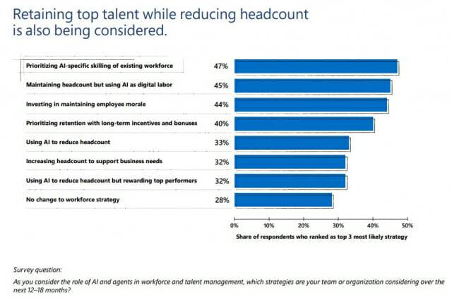 A: 리더의 47%가 향후 12-18개월 동안 기존 직원의 AI 기술 향상을 최우선 인력 전략으로 꼽았습니다. 또한 AI 문해력을 기르고, 학습 내용을 공유하며, 이를 일상 업무 관행에 통합하는 기대치를 모든 직원에게 설정하는 것이 중요합니다. 그리고 직원들이 에이전트를 개발하고 관리하는 방법을 배우면서 기술을 향상시킬 수 있는 경로를 만들어야 합니다.