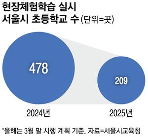 24일 서울시교육청에 따르면 올해 현장학습을 가는 서울의 초등학교는 3월 말 기준 전체 606개 학교 중 209곳(34%)뿐이다. 지난해 478개 학교가 현장학습을 갔던 것과 비교하면 반 토막이 났다.
