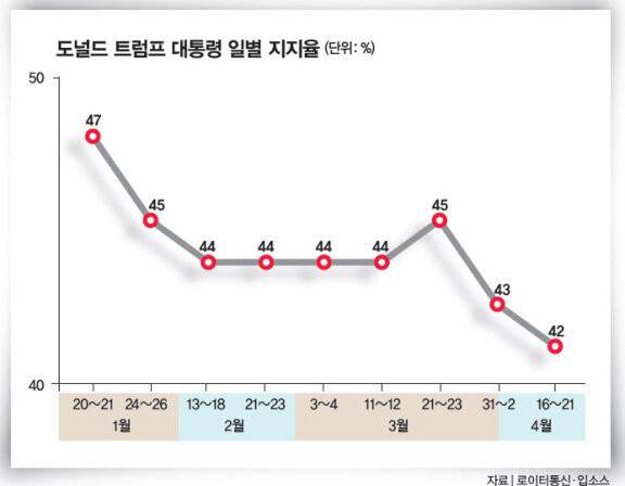 이후 고조된 반트럼프 정서가 조직화하며 '50501 운동'(50개 주에서 50개 시위를 같은 날 열자)을 주축으로 미국 전역에서 항의 집회가 잇따르고 있다. 4월 5일에는 50개 주 1200여 곳에서, 2주 뒤인 19일에는 700여 곳에서 시가행진이 벌어졌다. 참가자들은 "손을 떼라(Hands Off)" "수치다(Shame)" "왕은 없다(No kings)" 등 구호를 외치며 연방 공무원 해고, 이민자 추방, 성소수자 권리 축소, 대규모 관세 등 트럼프 행정부 정책을 전방위적으로 비판했다. 그 밖에 재정 지원 문제로 트럼프와 갈등하는 아이비리그 대학에서도 집회 열기가 뜨겁다.이 같은 여론 변화는 지지율에 고스란히 반영되고 있다. 로이터통신과 여론조사업체 입소스가 미국 성인 4306명을 대상으로 실시해 4월 21일 발표한 여론조사 결과에서 '트럼프 대통령의 직무수행 긍정 평가'는 42%로 나타났다(그래프 참조). 취임 후 최저 수준으로, 직전 4월 2일 조사에서 집계된 43%보다 1%p 낮아졌다. 트럼프는 1월 20일 취임 당시 지지율 47%를 기록한 바 있다. 트럼프가 자신감을 보인 경제 분야만 따로 떼어놓고 봐도 결과는 마찬가지다. 로이터통신과 입소스가 4월 23일 공개한 '트럼프 대통령 경제정책 지지율'은 37%로 집권 1~2기를 통틀어 가장 낮았다.