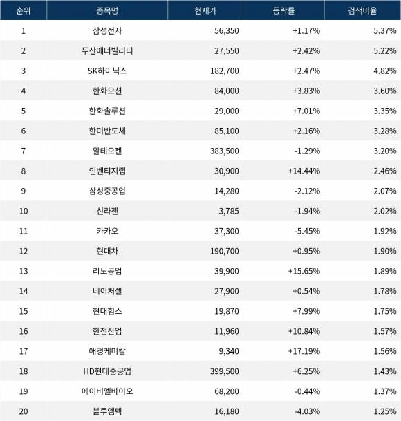 이밖에도 리노공업(058470) ▲15.65%, 애경케미칼(161000) ▲17.19%, 한전산업(130660) ▲10.84%, 현대힘스(460930) ▲7.99% 등이 많이 검색되고 있다.