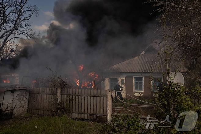 (포크로우스크 AFP=뉴스1) 우동명 기자 = 22일(현지시간) 우크라이나 도네츠크주 포크로우스크에서 러시아 군의 포격을 받은 주택서 불길과 검은 연기가 솟아 오르고 있다. 2025.04.25