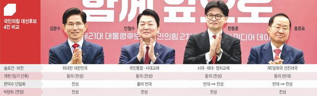 ②‘개헌’ 프레임. 국민의힘 네 후보가 개헌이 꼭 필요하다는 생각은 공유한다. 다만 임기단축 개헌론에는 조금씩 입장이 다르다. 홍준표 후보는 “임기단축은 안 된다”고 했고, 한동훈 후보는 “임기단축 없는 개헌은 안 된다”는 입장이다. 안철수 후보는 내년 6월 지방자치 선거와 개헌을 위한 국민투표를 제안했다. 그럼에도 네 후보가 이번 대선을 ‘호헌세력(이재명) 대 개헌세력(국민의힘)’이라는 프레임으로 가져가면 유권자의 투표에 영향을 미칠 수 있다.