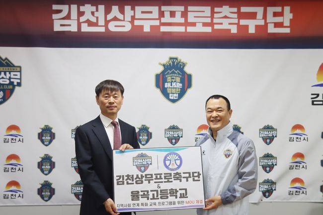 김천상무는 지난 24일 김천율곡고등학교와 ‘지역사회 연계 특화 교육 프로그램 운영 및 교육 협력 확대를 위한 업무협약’을 체결했다. 협약식에는 율곡고 이충희 교장과 김천상무 이재하 대표이사가 참석했다.