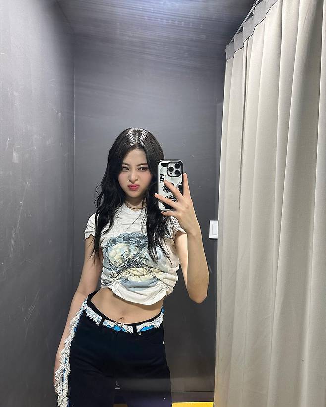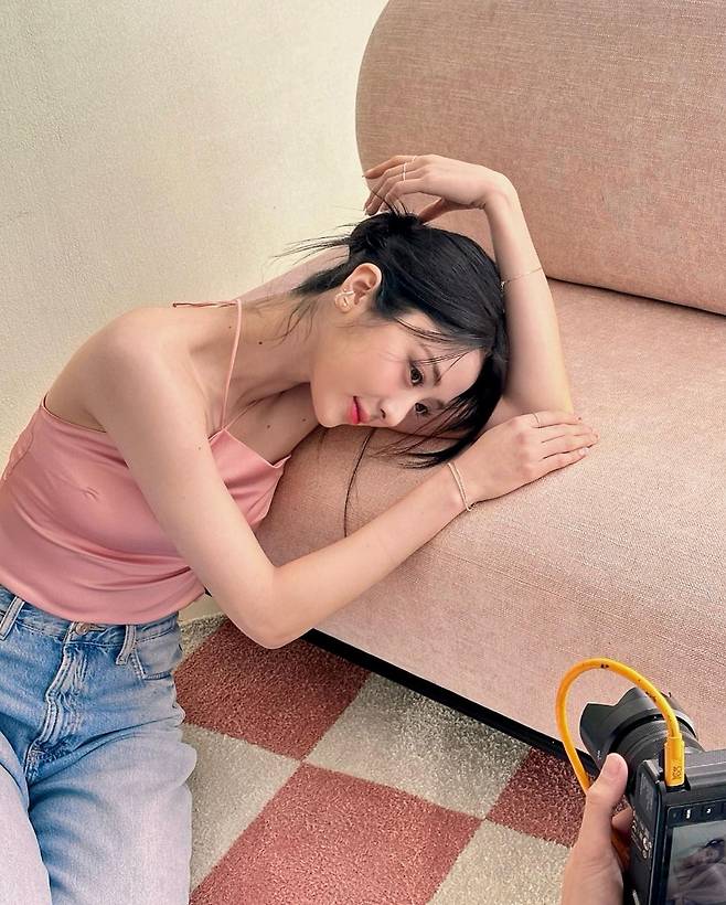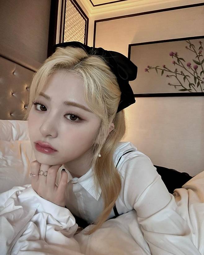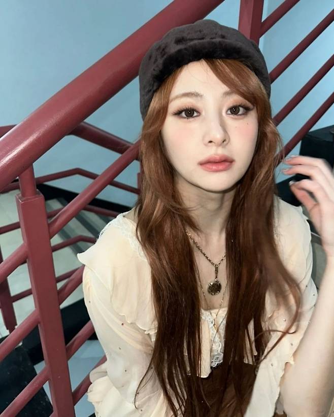 오렌지 헤어에는 전반적으로 밝고 따뜻한 색조 메이크업이 잘 어울려요. 허윤진은 살구색 블러셔와 피치 코랄 립으로 봄웜톤 룩을 완성했죠. 눈썹은 한 톤 어두운 브라운으로 정리해 밝은 주황빛 머리에 자연스러운 대비를 주었습니다.
