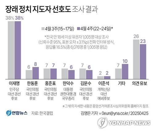 (서울=연합뉴스) 이재윤 기자 = 한국갤럽은 지난 22~24일 전국 만 18세 이상 유권자 1천5명을 대상으로 조사(95% 신뢰수준에 표본오차 ±3.1%포인트)한 결과 민주당 이재명 후보가 38%로 집계됐다고 밝혔다.