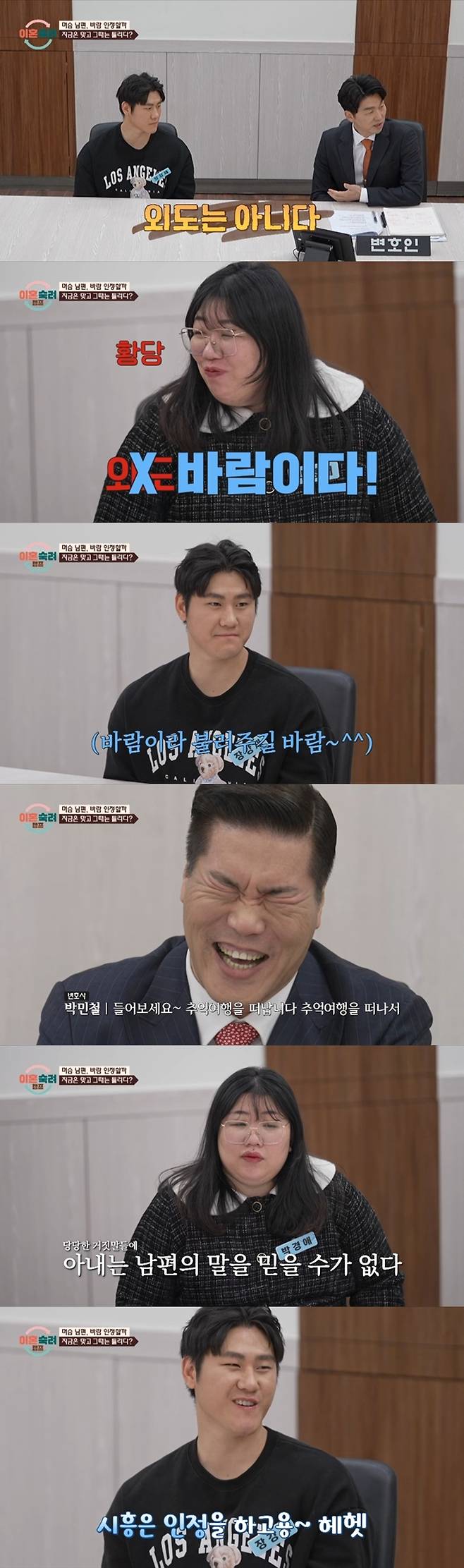 하지만 남편 측의 박민철 변호사는 "남편과 상담을 했을 때 강하게 외도는 아니라고 했다"며 "외도가 아닌 바람"이라고 말해 아내를 헛웃음 짓게 만들었다.