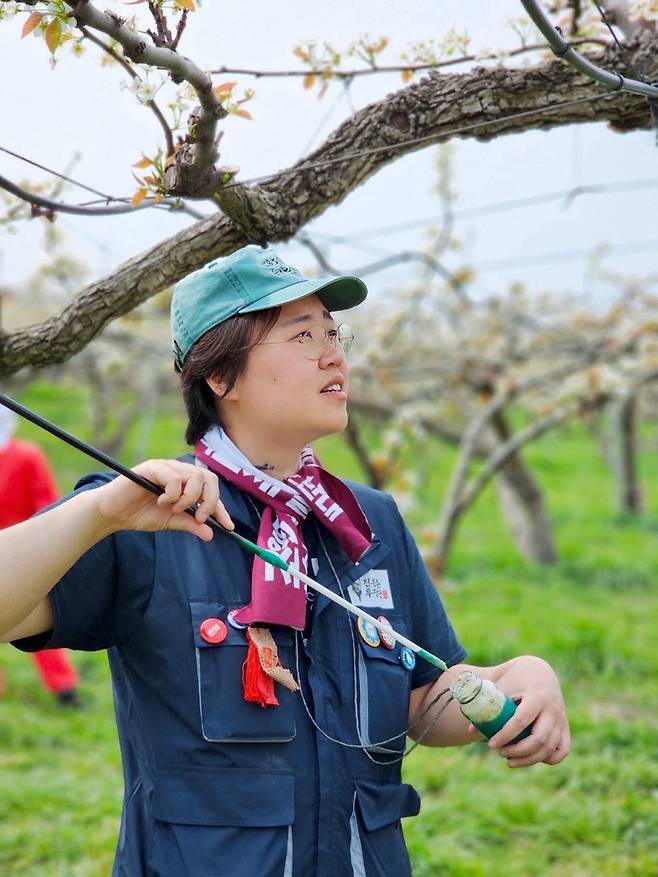 | ▲ 충남 아산의 주원농원 배밭에서 '말벌 동지'들과 인공 수분 작업을 하고 있는 김후주씨. |