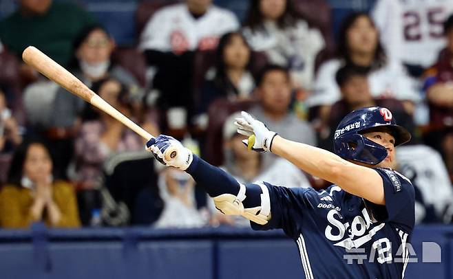 김재환의 방망이는 1회부터 불타올랐다. 정수빈과 양의지의 안타로 만들어진 2사 1, 2루 상황 타석에 들어선 김재환은 상대 선발 김연주의 5구째 패스트볼을 잡아당겼다. 타구는 우중간 펜스를 직격하는 2타점 적시 3루타로 연결됐다.
