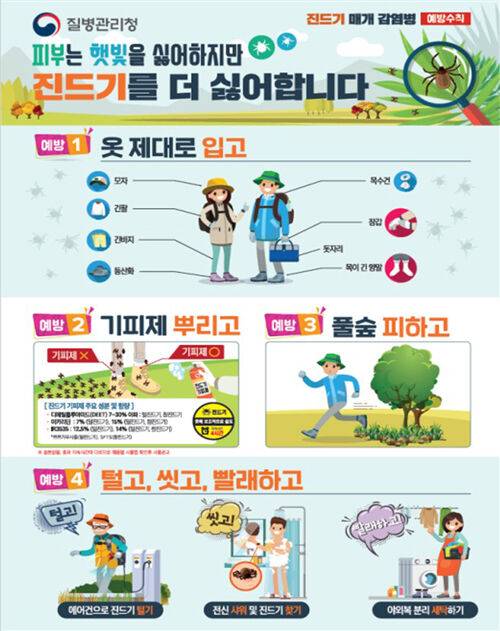 특히 농작업이나 야외 활동을 할 때 긴소매 옷과 긴 바지를 착용하고 진드기 기피제를 적절한 주기로 사용하는 등 예방 수칙을 지키고, 야외 활동 후에는 몸을 씻으면서 참진드기가 몸에 붙어 있는지 확인해야 합니다.