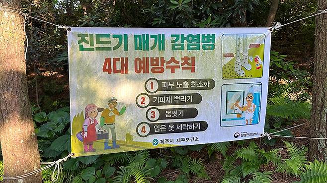 ▲ 제주시 한 오름에 걸린 '진드기 매개 감염병 예방 수칙' 현수막