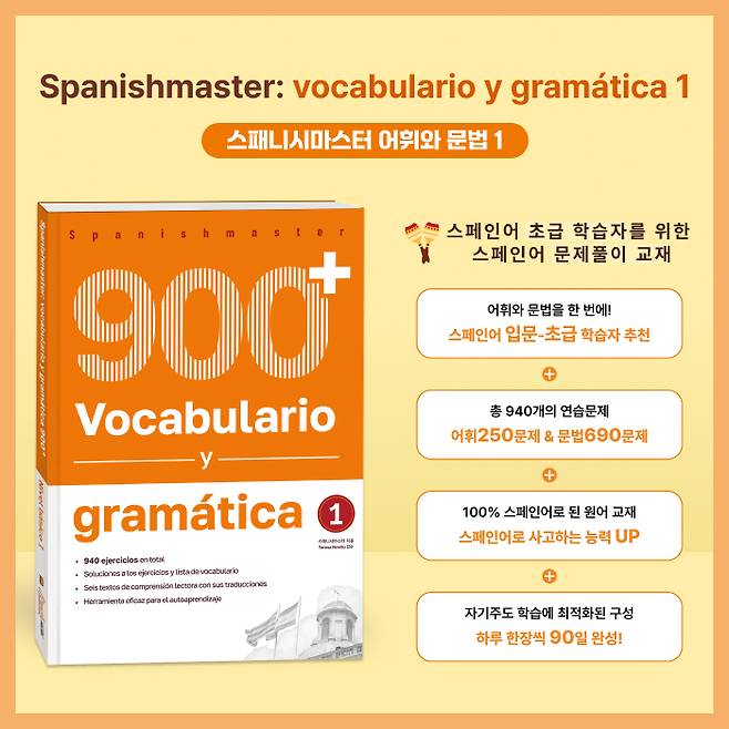스패니시마스터 출판 담당자는 “초급 스페인어 필수 커리큘럼을 반영해 스페인어 어휘와 문법을 기초부터 탄탄하게 다질 수 있도록 구성했다” 면서 “그림 보고 맞추기, 십자말풀이 등 다양한 유형의 문제로 학습 흥미를 유지할 수 있도록 신경 썼다. 940문제를 다 풀고 나면 초급 스페인어 어휘와 문법을 자연스럽게 자신의 것으로 만들 수 있을 것’이라고 밝혔다.