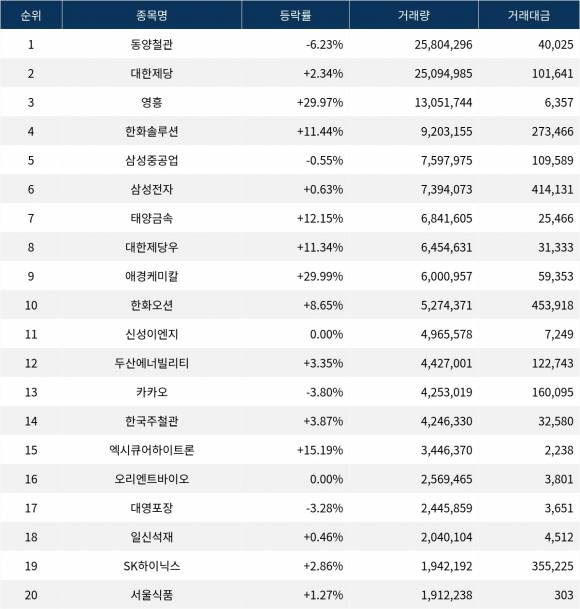 한편 거래량 상위 20위권 종목들은 신성이엔지(011930) 0.00%, 두산에너빌리티(034020) ▲3.35%, 카카오(035720) ▼3.80%, 한국주철관(000970) ▲3.87%, 엑시큐어하이트론(019490) ▲15.19%, 오리엔트바이오(002630) 0.00%, 대영포장(014160) ▼3.28%, 일신석재(007110) ▲0.46%, SK하이닉스(000660) ▲2.86%, 서울식품(004410) ▲1.27% 등의 성적을 기록했다.